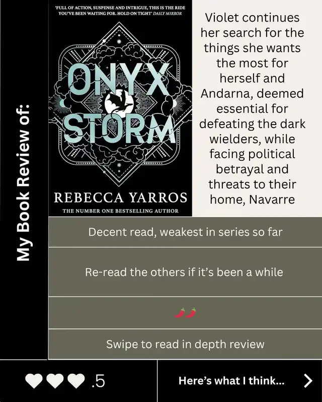 Onyx Storm book rating 5/5 This book is so good, but i am very biased because i absolutely love this series! All though i will say it ruined me, my heart still hurts, it literally feels like a break up. 😭 Overall i do, definitely, recommend this book!! 🤍 Theory (NO SPOILERS) : The next bo