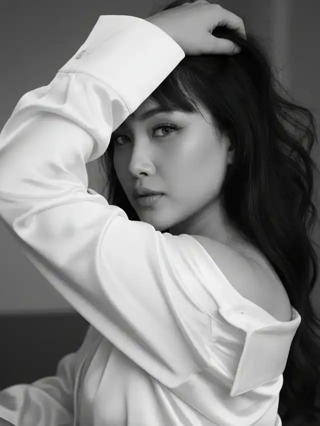 prompt👇👇👇 Un retrato cinematográfico glamoroso de mí, con mi cara real, al estilo de una foto editorial de moda. Primer plano con dramática luz natural proyectando sombras. Llevo una camisa de satin blanca con los hombros abiertos estoy sentada en una pose sexy y con una mirada tierna soñadora,