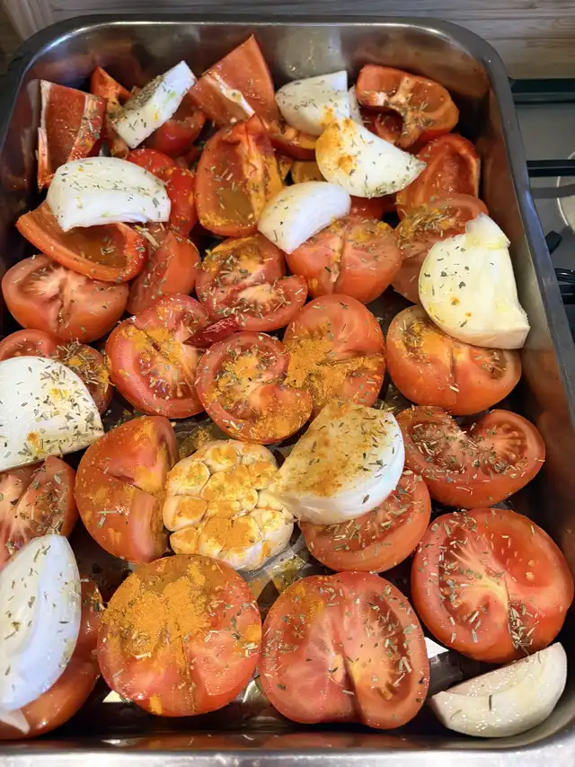 A traybake soup is always a winner as it’s so hands off but you get amazing depth of flavour. Try it this way which doesn’t involve any chopping- all i did was take the skin off the onion and chop the top off the garlic. I then peel the skins from the sweet potatoes and remove the stalk and seeds f